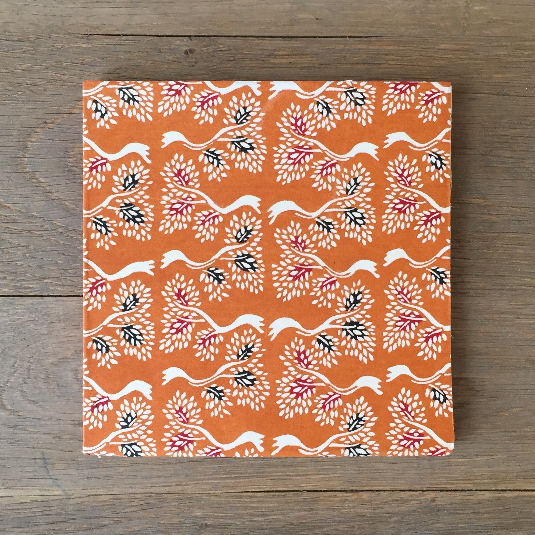 • Soft cover made of hand stenciled Japanese paper (Katazome) patterned with trees on an ochre background